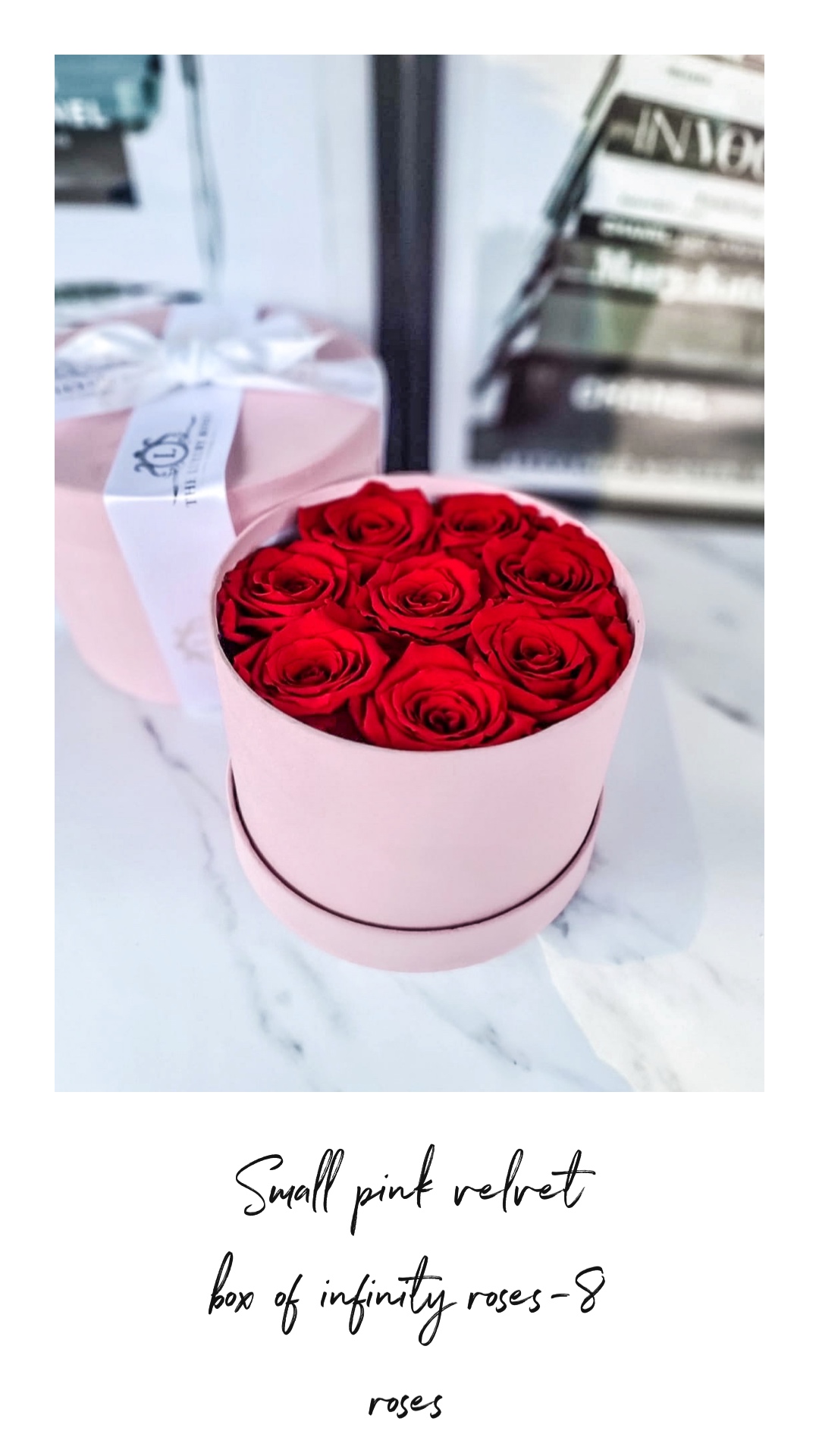 Boxed Infinity roses that last a year are the perfect luxury floral gift that make any special occasion unforgettable. With No maintenance or watering required, the Infinity roses will always look the same as when they were first cut.Including 6 oses. D13.5xh13. Printed logo ribbon